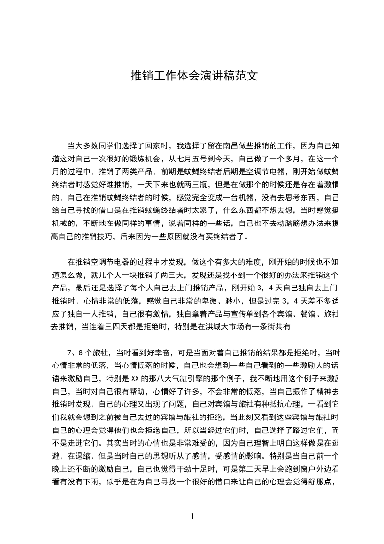 在推销空调节电器的过程中才发现,做这个有多大的难度,刚开始的时候也不知道怎么做,就几个人一块推销了两三天,发现还是找不到一个很好的办法来推销这个产品,最后还是选择了每个人自己去上门推销产品,刚开始3,4天自己独自去上门推销时,心情非常的低落,感觉自己非常的卑微、渺小,但是过完3,4天差不多适应了独自一人推销,自己很有激情,独自拿着产品与宣传单到各个宾馆、餐馆、旅社去推销,当连着三四天都是拒绝时,特别是在洪城大市场有一条街共有