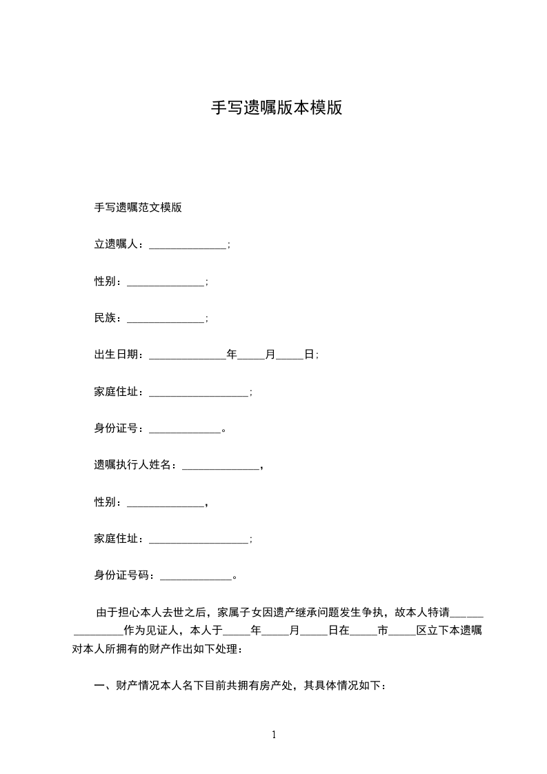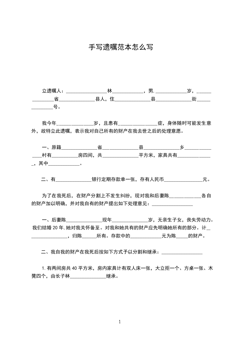 立遗嘱人:_________________林_____________,男,_____________岁,_______________省_______________县人,住_______________县_______________街_______________号。