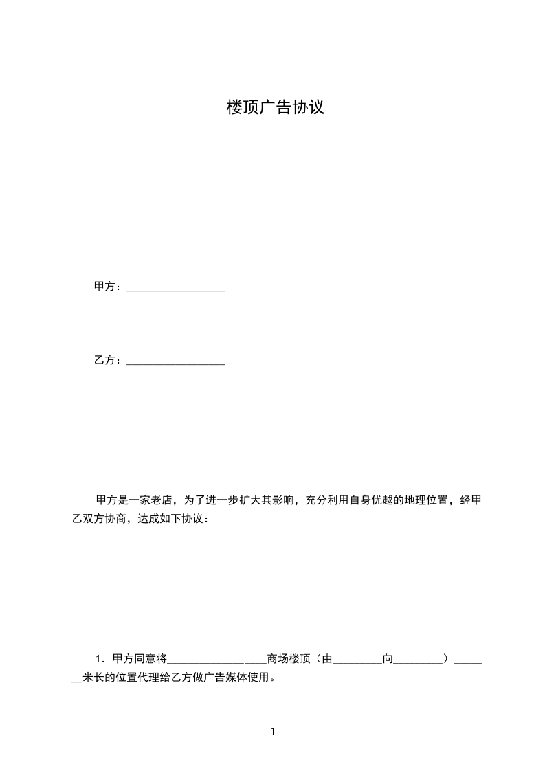 1.甲方同意将__________________商场楼顶(由_________向_________)_______米长的位置代理给乙方做广告媒体使用。