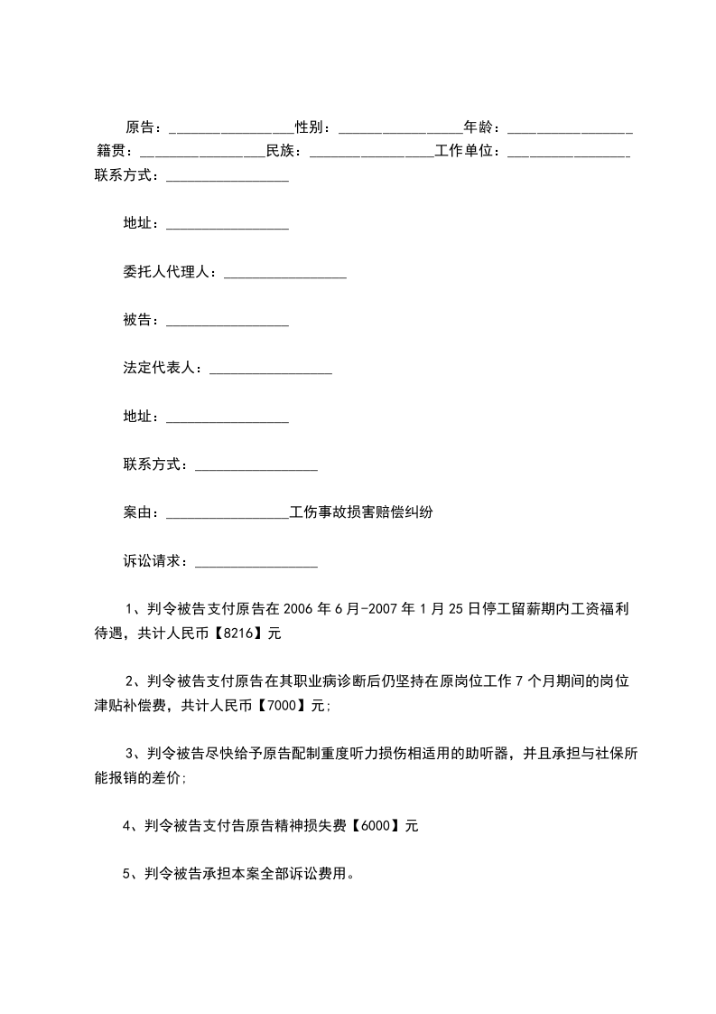 原告:_________________性别:_________________年龄:_________________籍贯:_________________民族:_________________工作单位:_________________联系方式:_________________