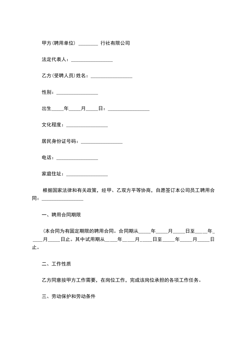 根据国家法律和有关政策,经甲、乙双方平等协商,自愿签订本公司员工聘用合同:_________________