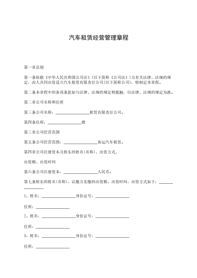 第一条依据《中华人民共和国公司法》(以下简称《公司法》)及有关法律、法规的规定,由人共同出资设立汽车租赁有限责任公司(以下简称公司),特制定本章程。
