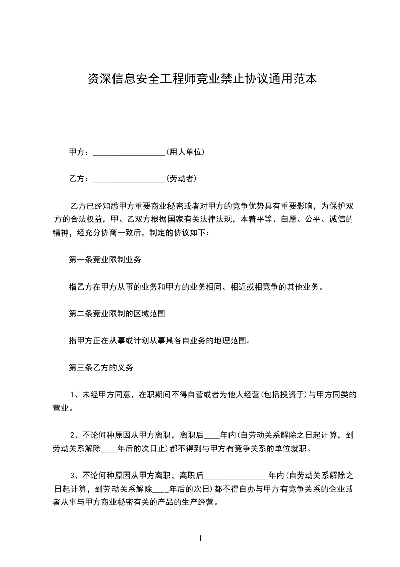 资深信息安全工程师竞业禁止协议
