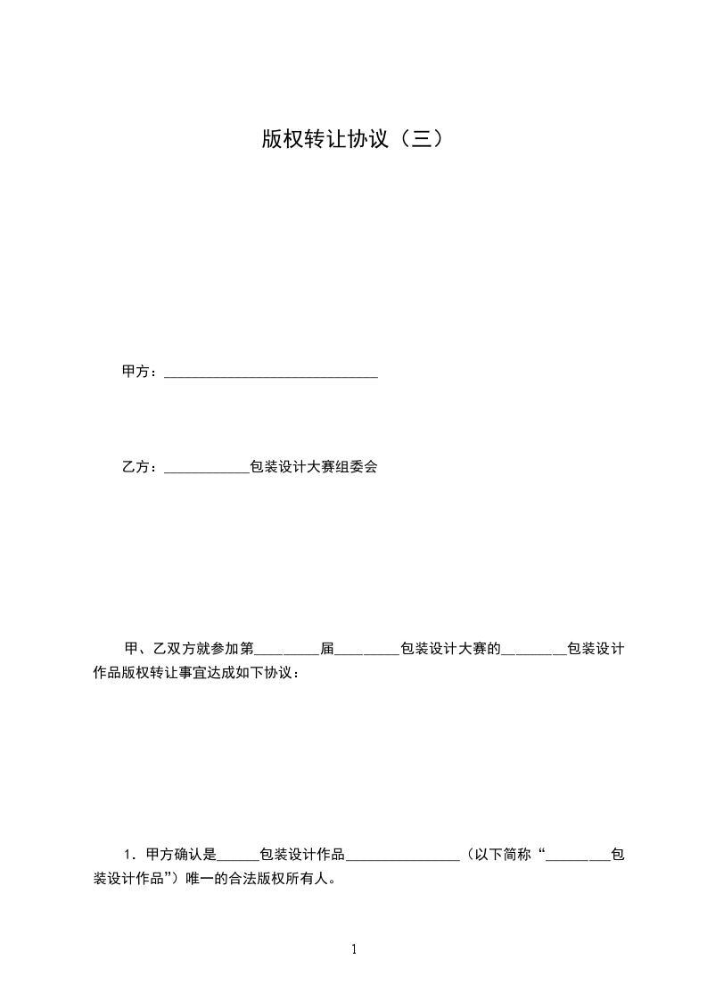 甲、乙双方就参加第_________届_________包装设计大赛的_________包装设计作品版权转让事宜达成如下协议:
