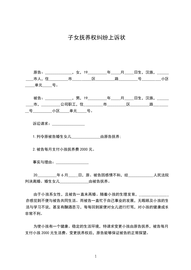 1.判令原被告婚生女儿_______________由原告抚养;