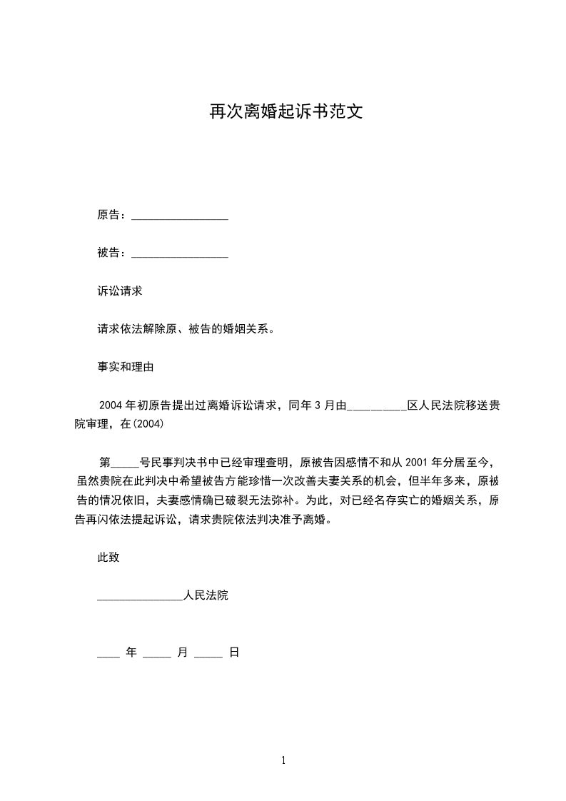 第_____号民事判决书中已经审理查明,原被告因感情不和从2001年分居至今,虽然贵院在此判决中希望被告方能珍惜一次改善夫妻关系的机会,但半年多来,原被告的情况依旧,夫妻感情确已破裂无法弥补。为此,对已经名存实亡的婚姻关系,原告再闪依法提起诉讼,请求贵院依法判决准予离婚。