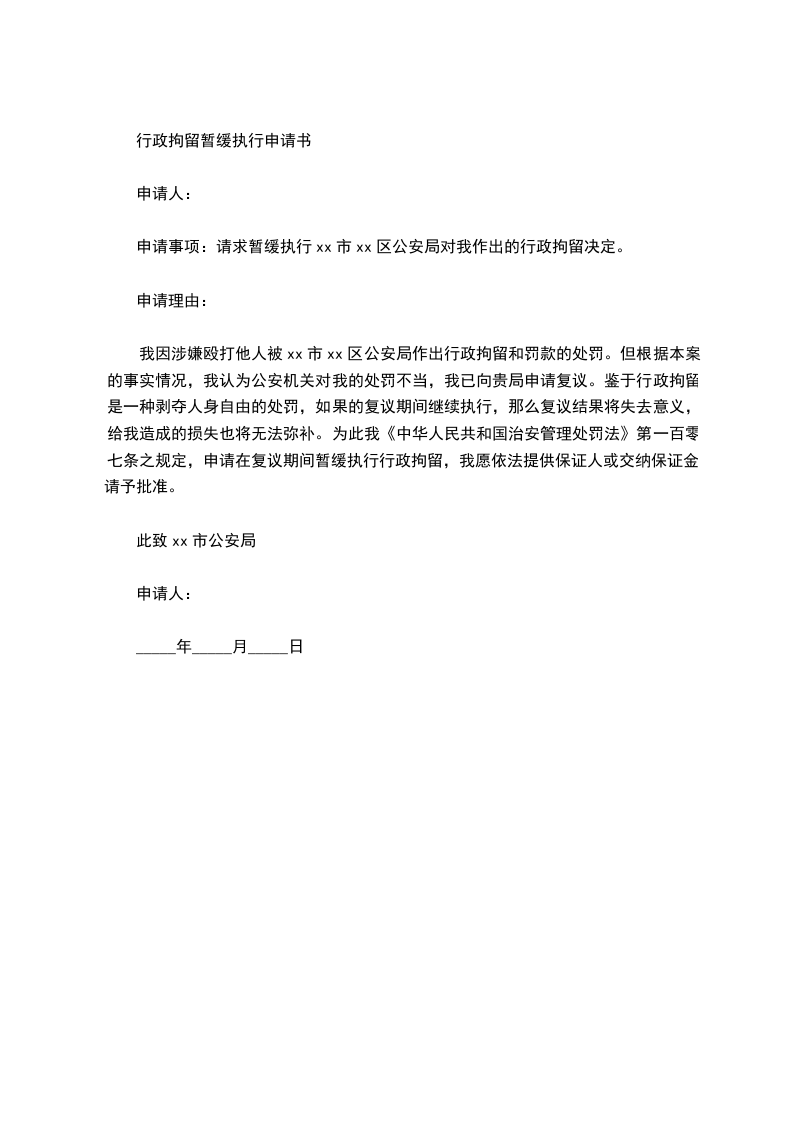 申请事项:请求暂缓执行xx市xx区公安局对我作出的行政拘留决定。