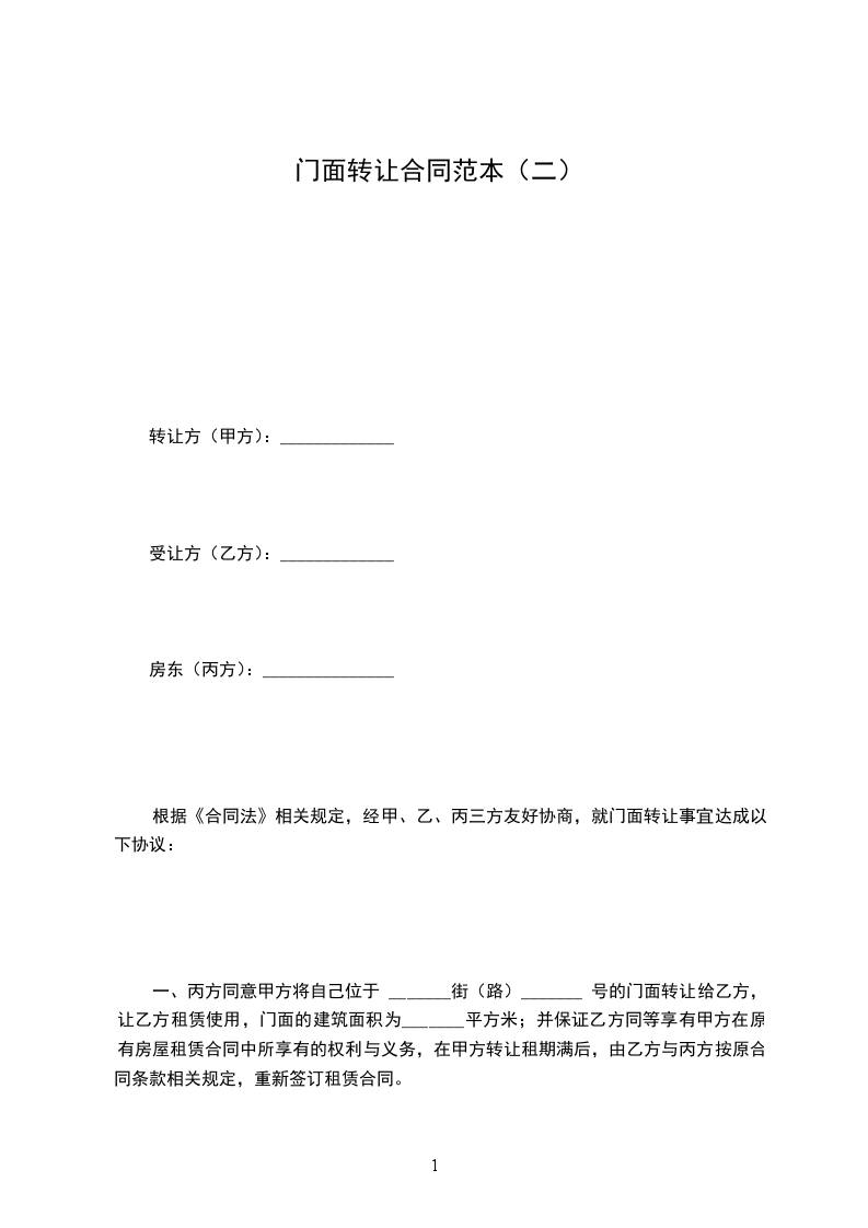 一、丙方同意甲方将自己位于 _______街(路)_______ 号的门面转让给乙方,让乙方租赁使用,门面的建筑面积为_______平方米;并保证乙方同等享有甲方在原有房屋租赁合同中所享有的权利与义务,在甲方转让租期满后,由乙方与丙方按原合同条款相关规定,重新签订租赁合同。