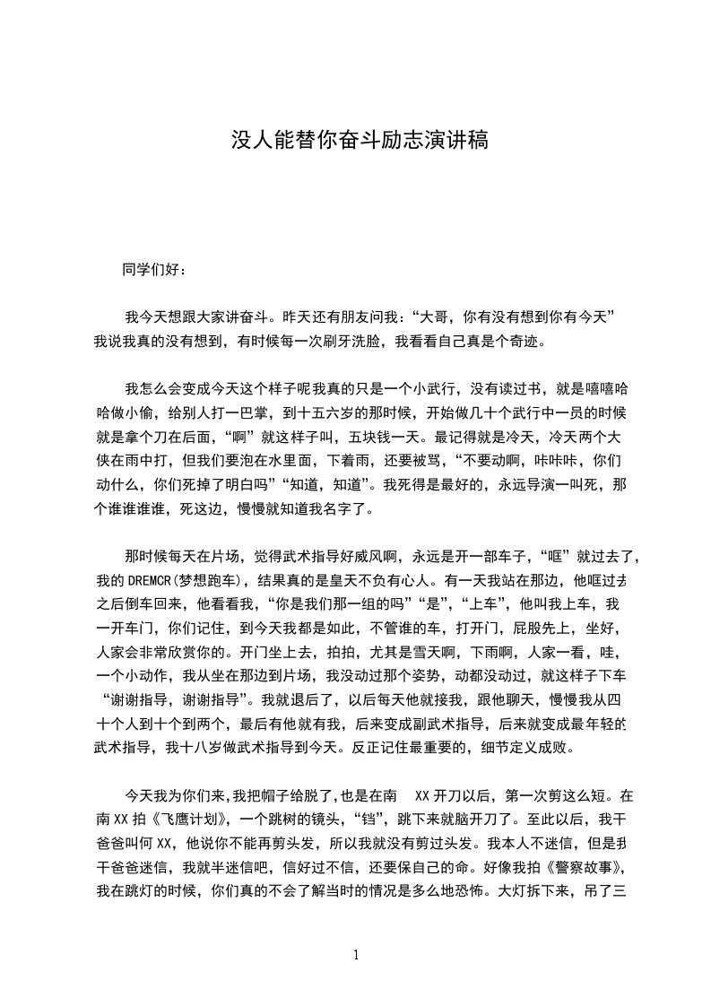 我今天想跟大家讲奋斗。昨天还有朋友问我:“大哥,你有没有想到你有今天”我说我真的没有想到,有时候每一次刷牙洗脸,我看看自己真是个奇迹。