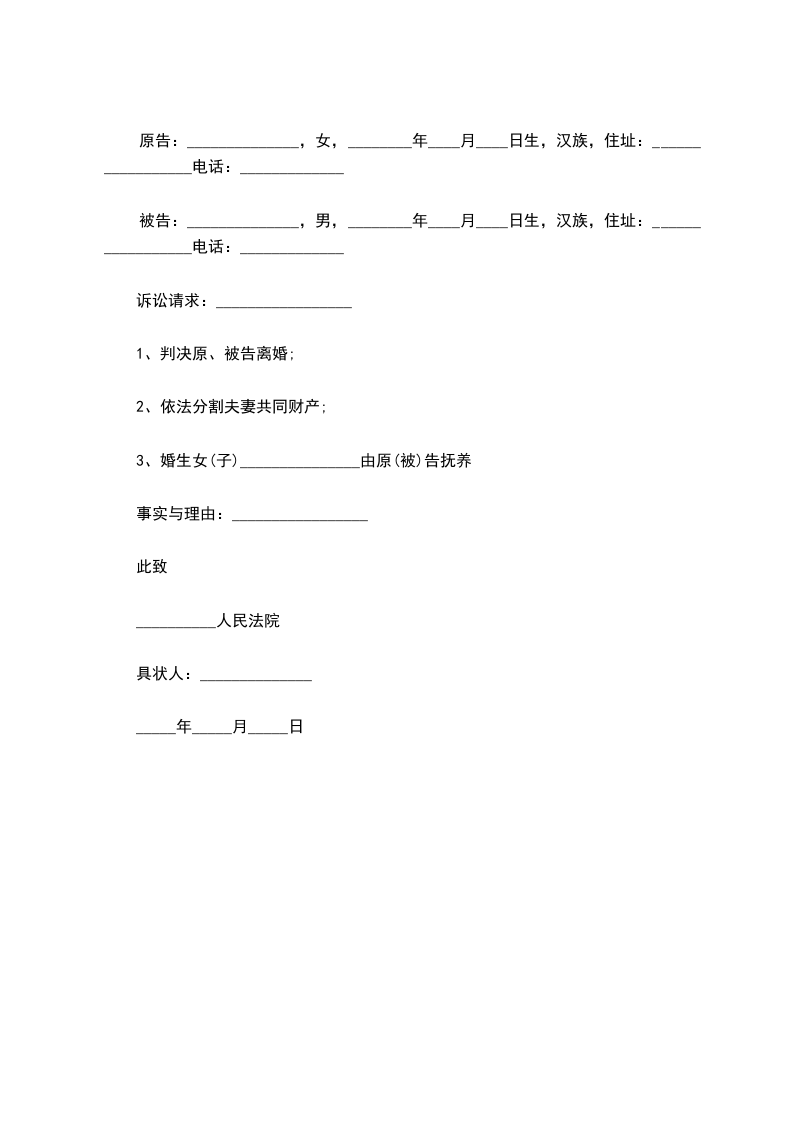 原告:______________,女,________年____月____日生,汉族,住址:_________________电话:_____________