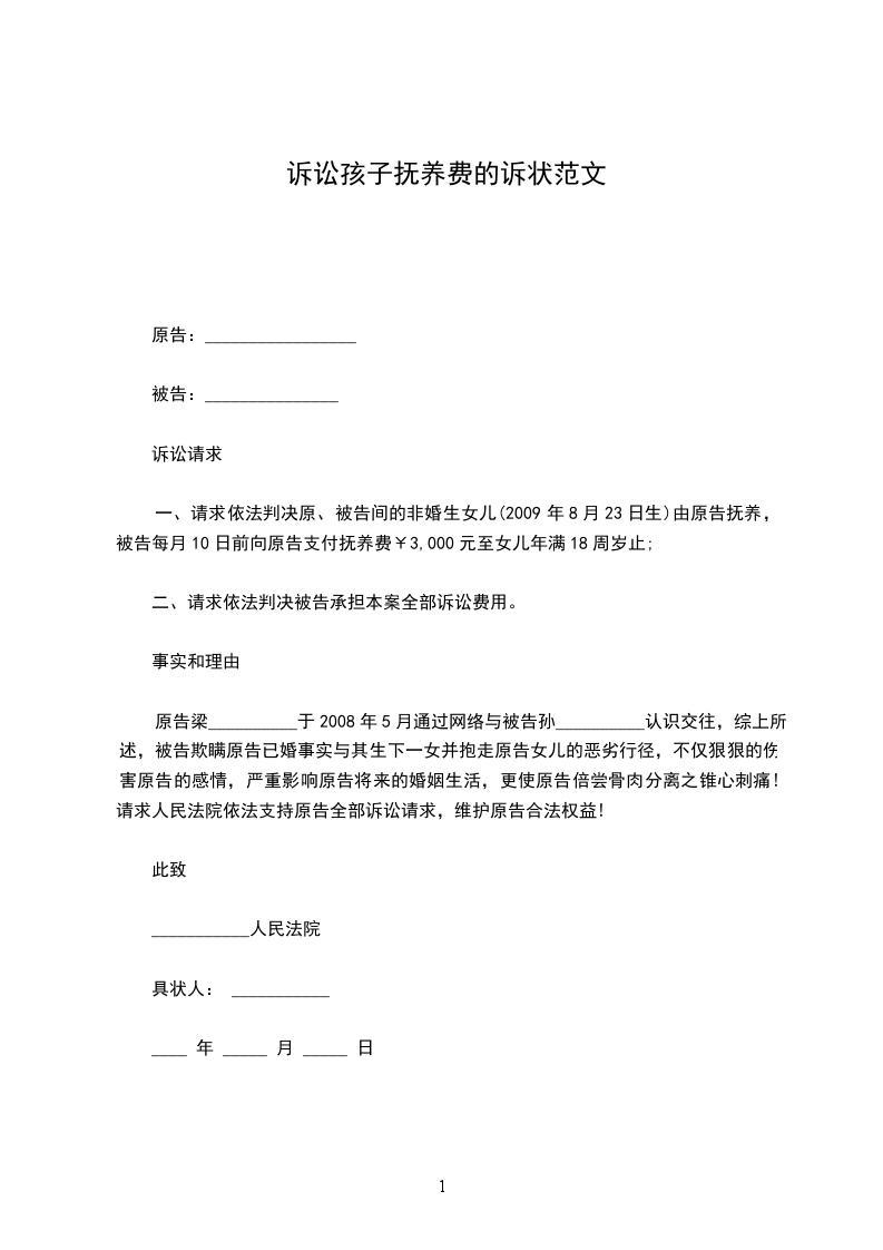一、请求依法判决原、被告间的非婚生女儿(2009年8月23日生)由原告抚养,被告每月10日前向原告支付抚养费¥3,000元至女儿年满18周岁止;
