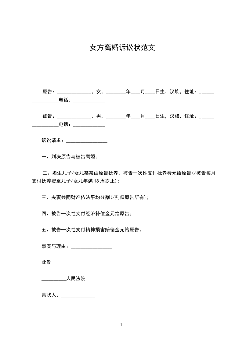 原告:______________,女,________年____月____日生,汉族,住址:_________________电话:_____________