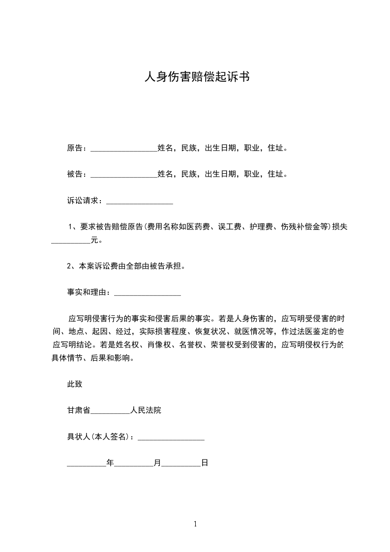1、要求被告赔偿原告(费用名称如医药费、误工费、护理费、伤残补偿金等)损失__________元。