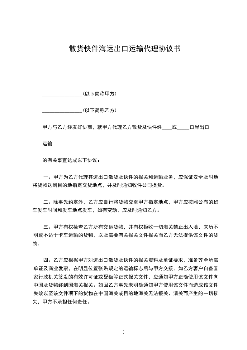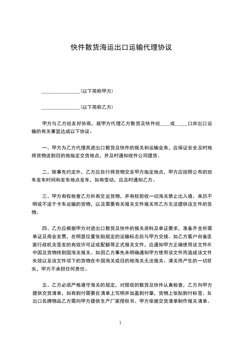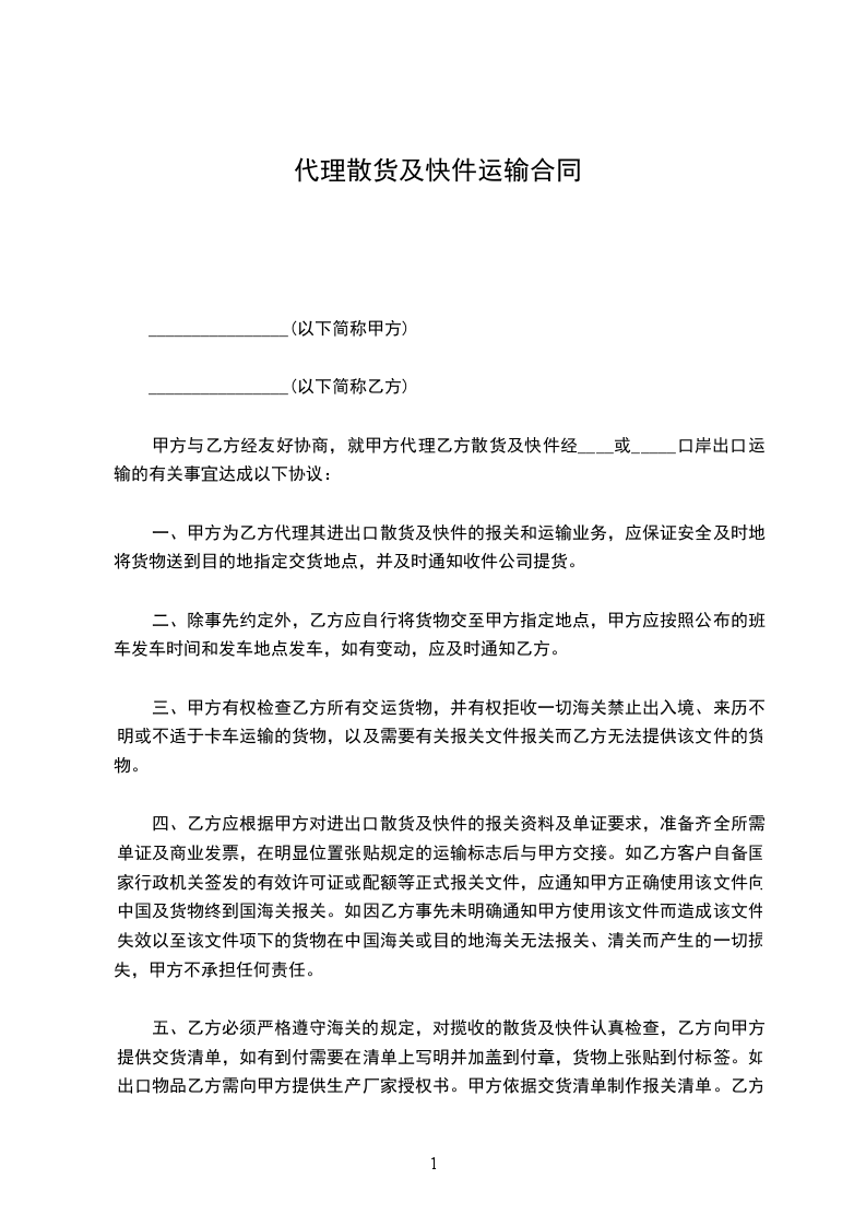一、甲方为乙方代理其进出口散货及快件的报关和运输业务,应保证安全及时地将货物送到目的地指定交货地点,并及时通知收件公司提货。