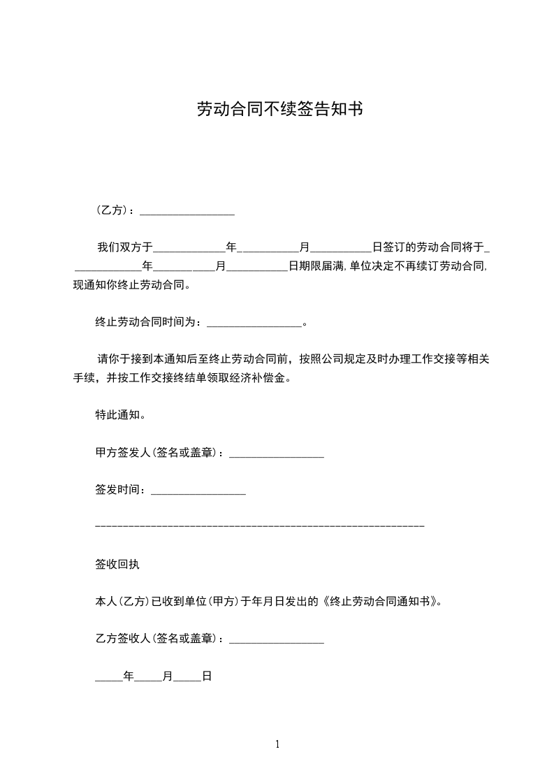 我们双方于_____________年___________月___________日签订的劳动合同将于_____________年___________月___________日期限届满,单位决定不再续订劳动合同,现通知你终止劳动合同。
