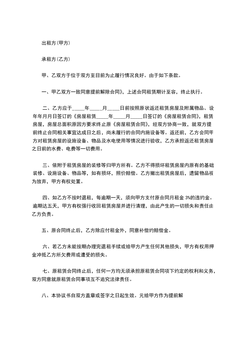 一、甲乙双方一致同意提前解除合同》,上述合同租赁期计至容,终止执行。