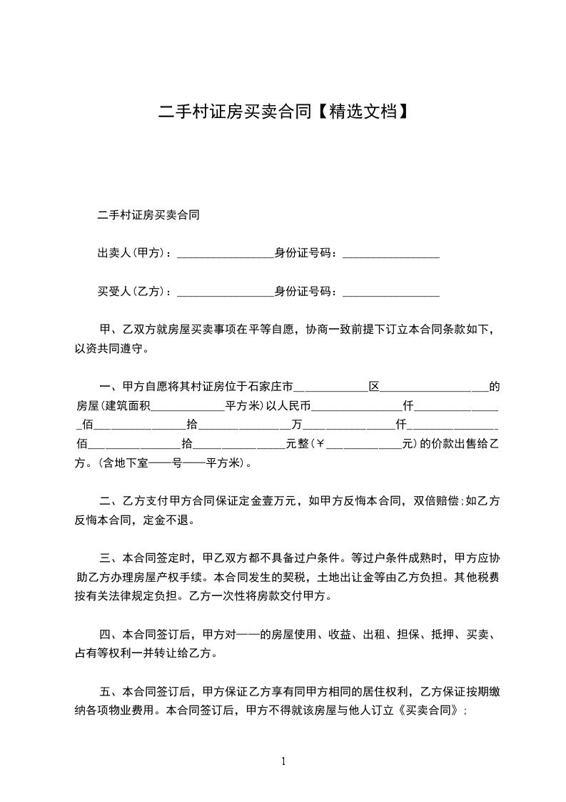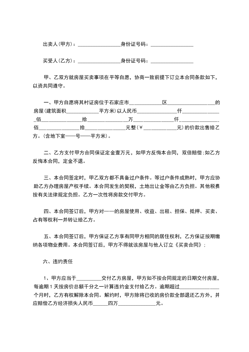 一、甲方自愿将其村证房位于石家庄市_____________区___________________的房屋(建筑面积_____________平方米)以人民币________________仟________________佰________________拾________________万________________仟________________佰________________拾________________元整(¥_____________元)的价款出售给乙方。(含地下室——号——平方米)。