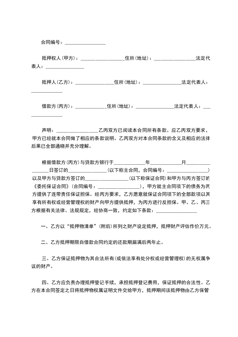 根据借款方(丙方)与贷款方银行于_____________年_____________月_________________日签订的________________(以下称主合同,合同编号:_________________)以及甲方与贷款方签订的__________________(以下称保证合同)和甲方与丙方签订的《委托保证合同》(合同编号:_________________),甲方就主合同项下的债务为丙方提供了连带责任保证担保。经丙方要求,乙方愿意就保证合同项下的全部款项以其享有所有权或经营管理权的财产向甲方提供抵押,为丙方进行反担保。甲、乙、丙三方根据有关法律、法规规定,经协商一致,约定如下条款:_________________