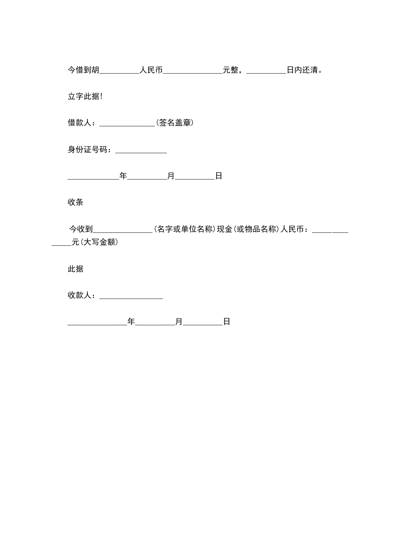 今借到胡__________人民币_______________元整,__________日内还清。
