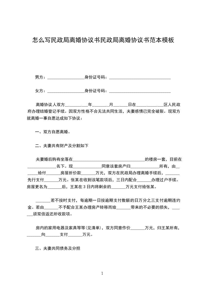 男女双方于________________年______月______日在_______________市区人民政府登记结婚。婚后未生育。因双方性格不合,矛盾不断加剧,致使夫妻感情彻底破裂,已无法共同生活,已无和好可能,经双方协议达成离婚意愿,并对财产、债务等事项已达成一致处理意见:_________________