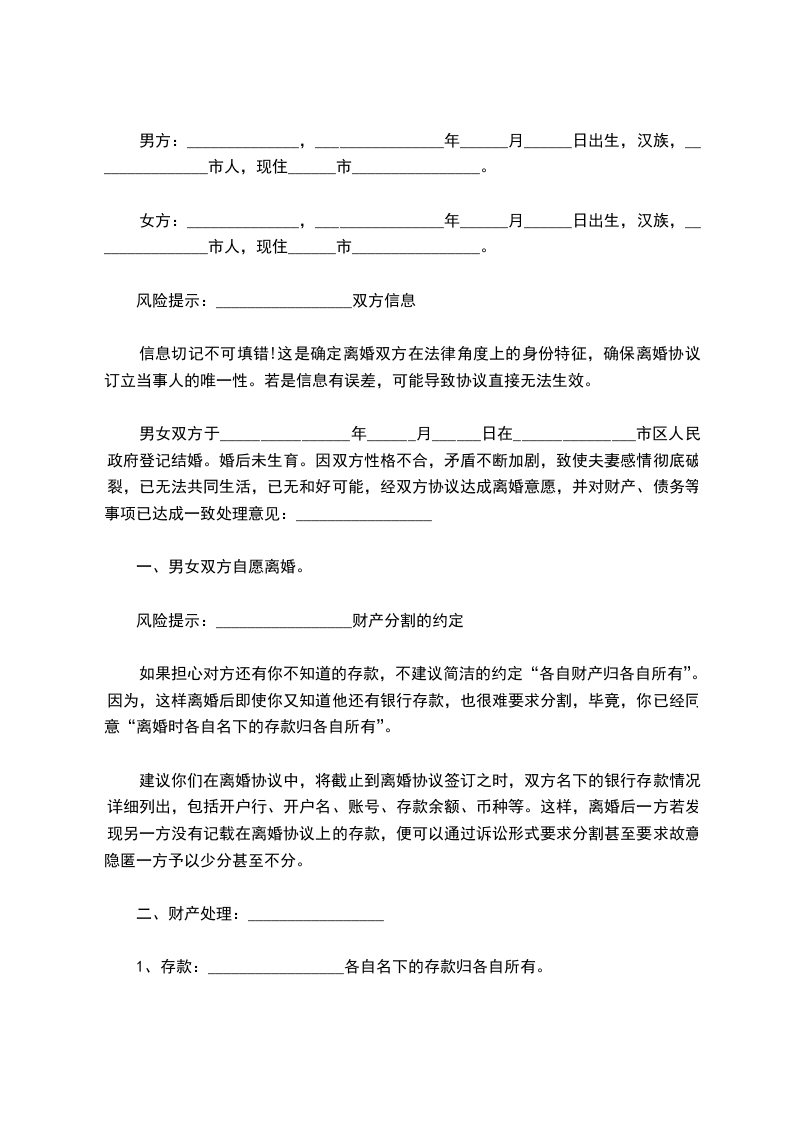 风险提示:_________________财产分割的约定