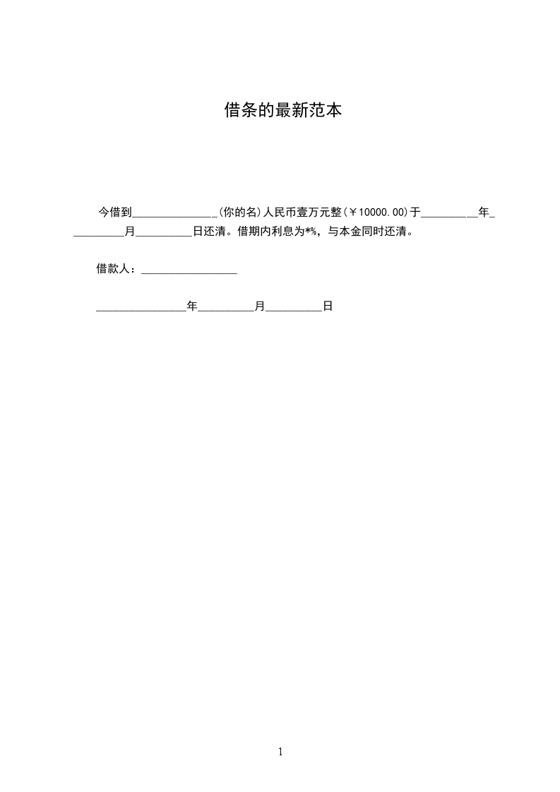 今借到_______________(你的名)人民币壹万元整(¥10000.00)于__________年__________月__________日还清。借期内利息为_____%,与本金同时还清。