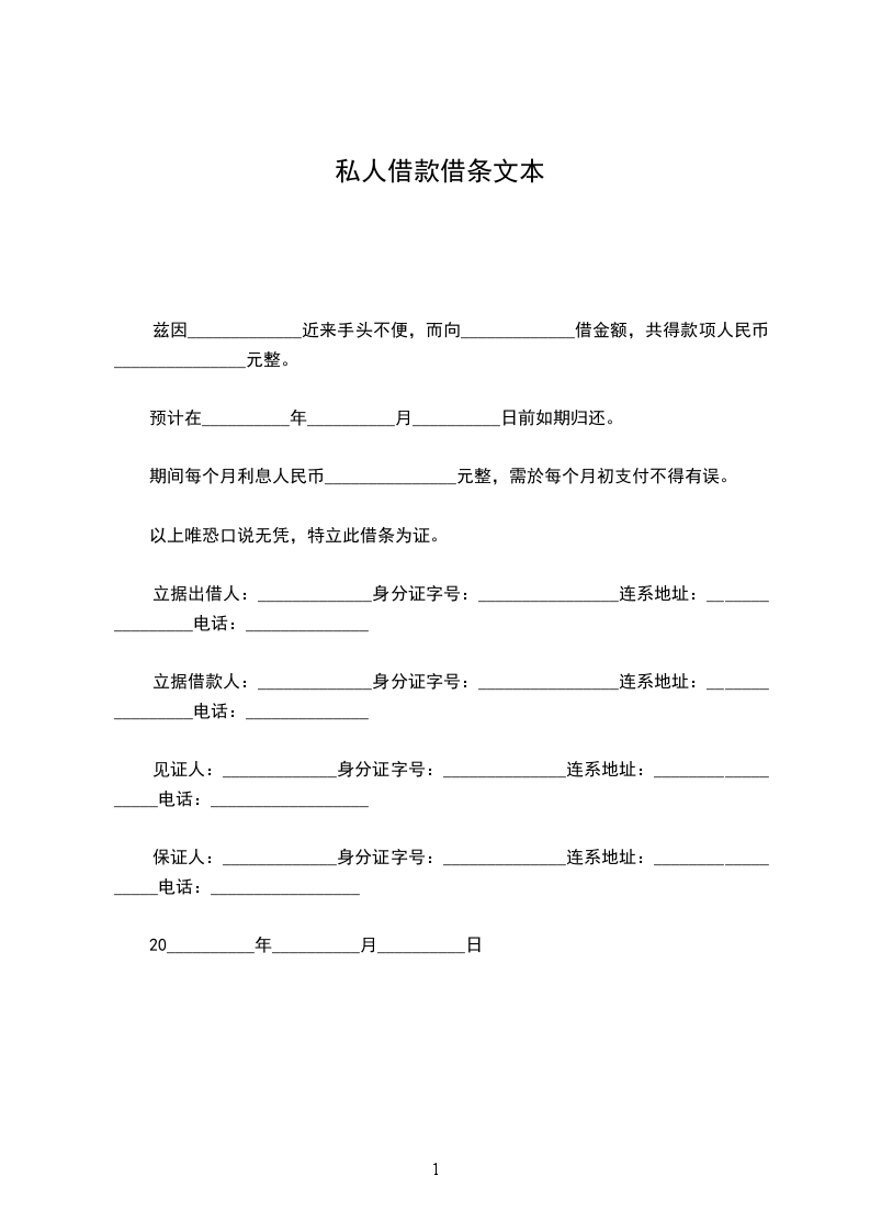兹因_____________近来手头不便,而向_____________借金额,共得款项人民币_______________元整。
