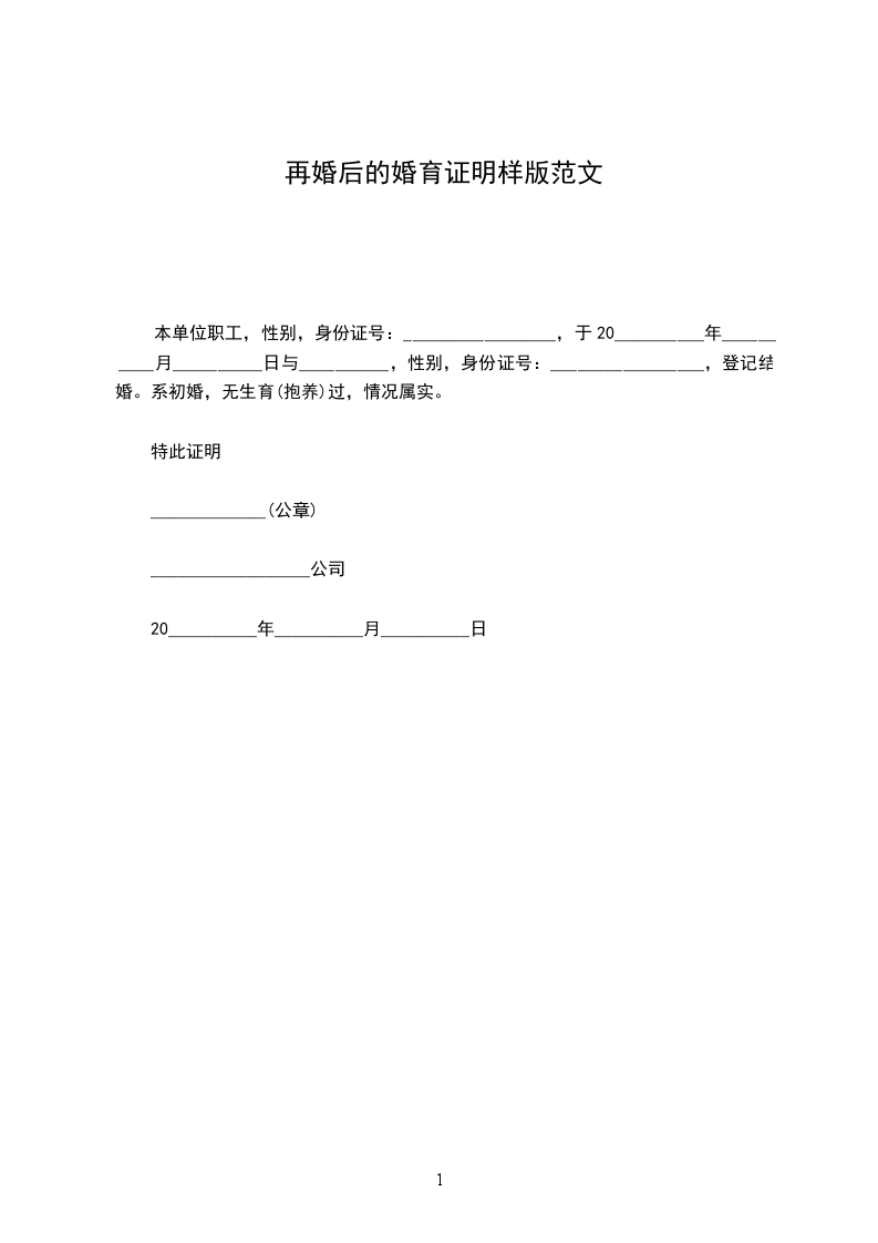 本单位职工,性别,身份证号:_________________,于20__________年__________月__________日与__________,性别,身份证号:_________________,登记结婚。系初婚,无生育(抱养)过,情况属实。