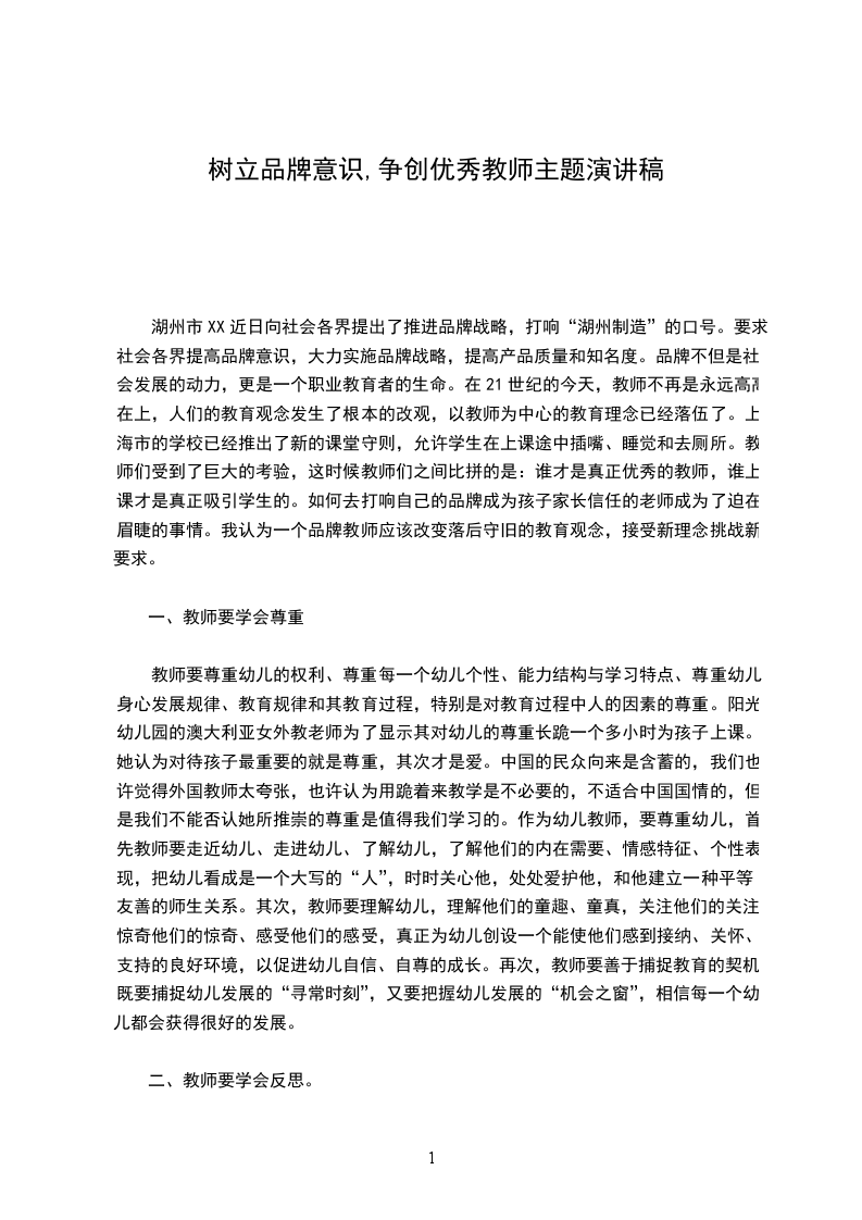 湖州市XX近日向社会各界提出了推进品牌战略,打响“湖州制造”的口号。要求社会各界提高品牌意识,大力实施品牌战略,提高产品质量和知名度。品牌不但是社会发展的动力,更是一个职业教育者的生命。在21世纪的今天,教师不再是永远高高在上,人们的教育观念发生了根本的改观,以教师为中心的教育理念已经落伍了。上海市的学校已经推出了新的课堂守则,允许学生在上课途中插嘴、睡觉和去厕所。教师们受到了巨大的考验,这时候教师们之间比拼的是:谁才是真正优秀的教师,谁上课才是真正吸引学生的。如何去打响自己的品牌成为孩子家长信任的老师成为了迫在眉睫的事情。我认为一个品牌教师应该改变落后守旧的教育观念,接受新理念挑战新要求。