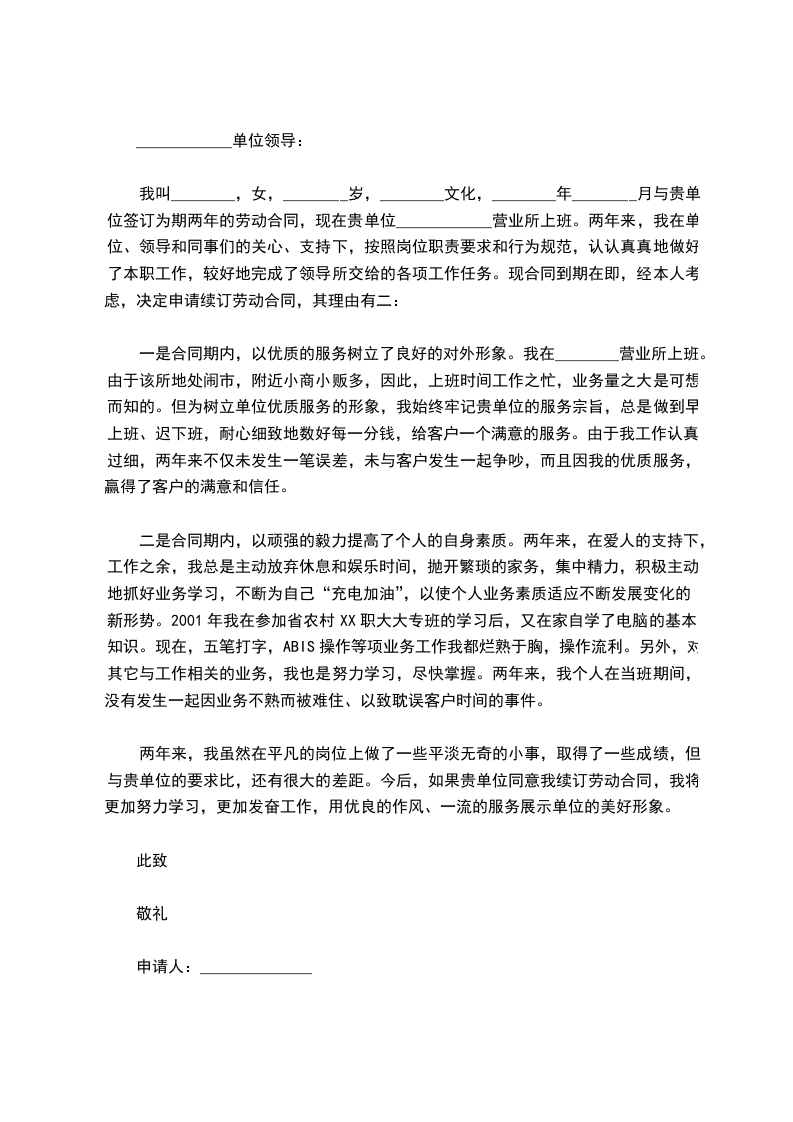 我叫________,女,________岁,________文化,________年________月与贵单位签订为期两年的劳动合同,现在贵单位____________营业所上班。两年来,我在单位、领导和同事们的关心、支持下,按照岗位职责要求和行为规范,认认真真地做好了本职工作,较好地完成了领导所交给的各项工作任务。现合同到期在即,经本人考虑,决定申请续订劳动合同,其理由有二: