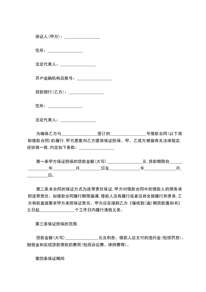 第一条甲方保证担保的贷款金额(大写)_________________元,贷款期限自________________年___________月__________日至_______________年_______________月___________日。