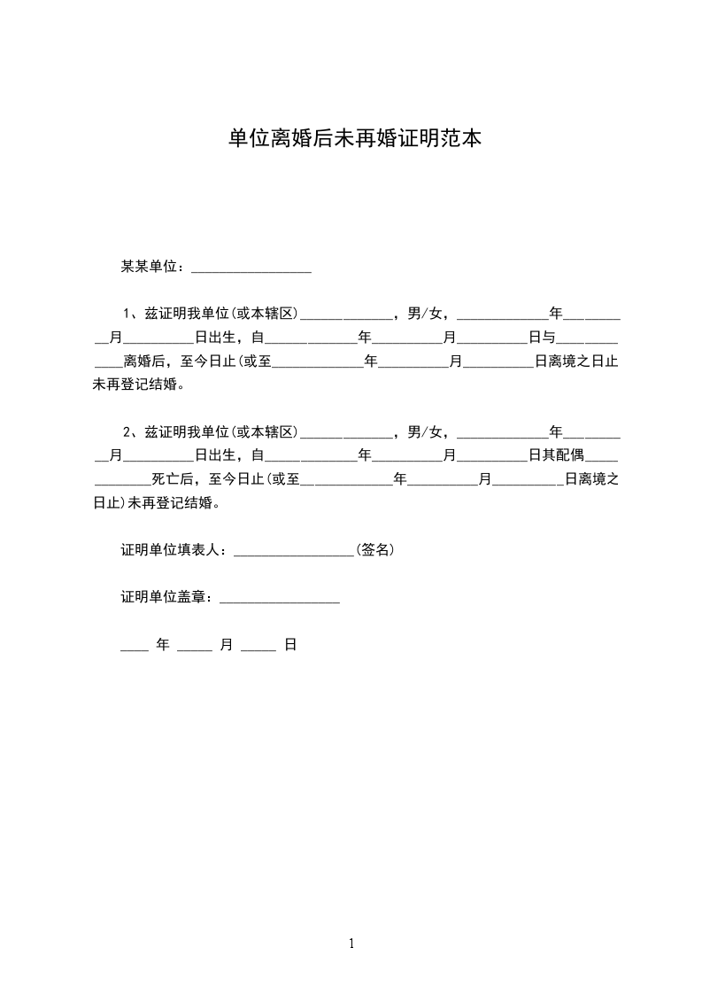 1、兹证明我单位(或本辖区)_____________,男/女,_____________年__________月__________日出生,自_____________年__________月__________日与_____________离婚后,至今日止(或至_____________年__________月__________日离境之日止)未再登记结婚。