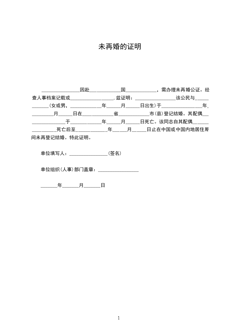 2、兹证明我单位(或本辖区)_____________,男/女,_____________年__________月__________日出生,自_____________年__________月__________日其配偶_____________死亡后,至今日止(或至_____________年__________月__________日离境之日止)未再登记结婚。