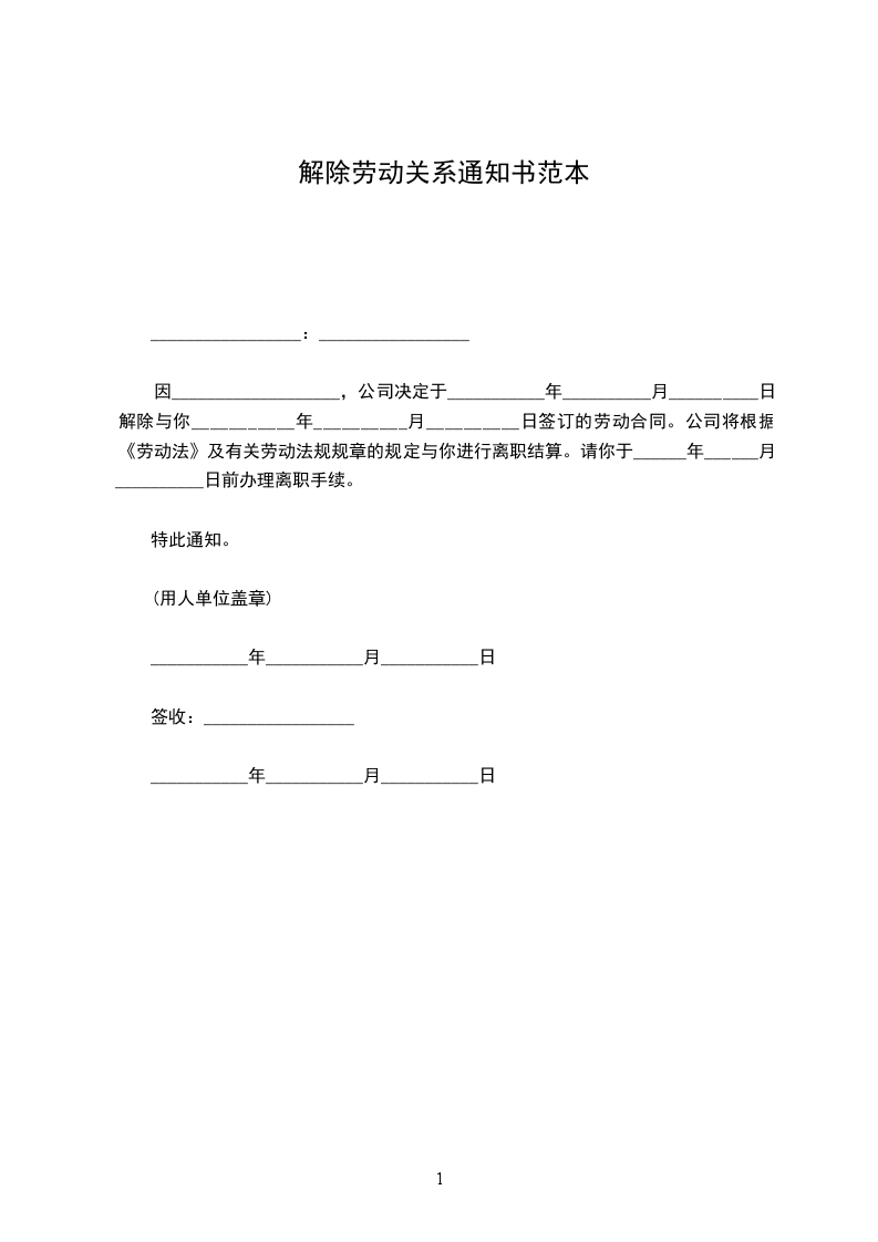 因___________________,公司决定于___________年__________月__________日解除与你___________年__________月__________日签订的劳动合同。公司将根据《劳动法》及有关劳动法规规章的规定与你进行离职结算。请你于______年______月__________日前办理离职手续。