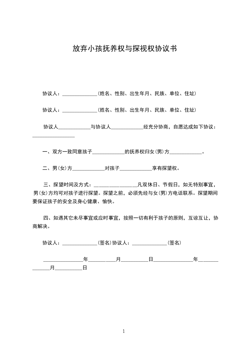 三、探望时间及方式:_________________凡双休日、节假日,如无特别事宜,男(女)方均可对孩子进行探望。探望之前,必须先经与女(男)方电话联系。探望期间,要保证孩子的安全及身心健康、愉快。