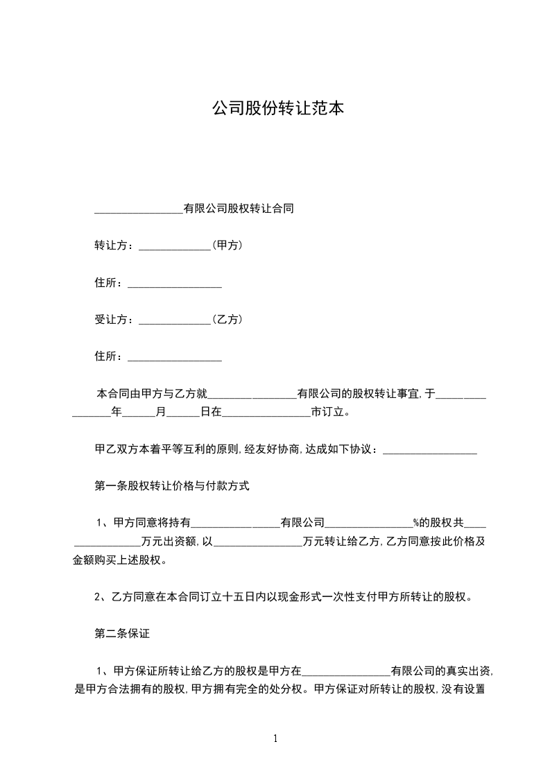1、甲方同意将持有________________有限公司________________%的股权共________________万元出资额,以________________万元转让给乙方,乙方同意按此价格及金额购买上述股权。