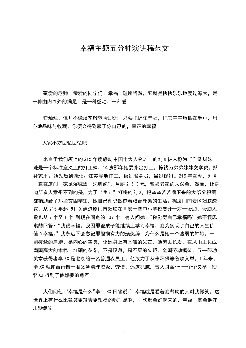 幸福五分钟演讲稿篇三今天站在这里,我们首先想问同学们一个问题:你知道,幸福是什么吗我想说,幸福是早上睁开眼睛,看到阳光洒满了房间,我能嗅出阳光和早晨的味道;幸福是阳光明媚的上午,我抱着本自己喜欢的书,坐在露天的阳台上,享受风吹过,文字划过;幸福是小雨淅沥的午后,我在雨中,看见了舞蹈的小草,听见了雨滴落在地面的声音;幸福是华灯初上的傍晚,我走在回家的路上,听到一首熟悉的老歌,回忆在脑海里逐渐清晰;幸福是“吹面不寒杨柳风”的舒适,是令我经常“蓦然回首”的微笑。可是