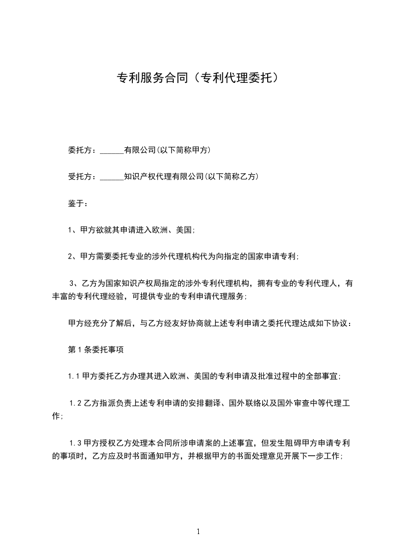 1.1甲方委托乙方办理其进入欧洲、美国的专利申请及批准过程中的全部事宜;