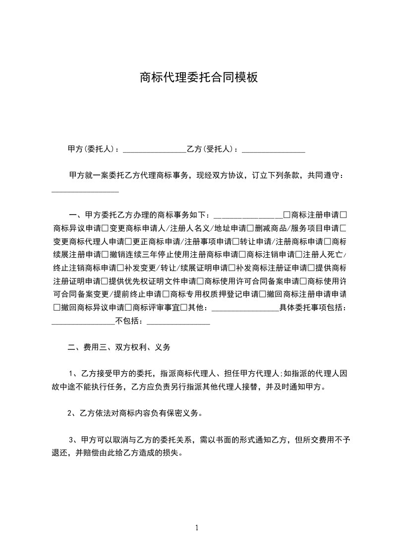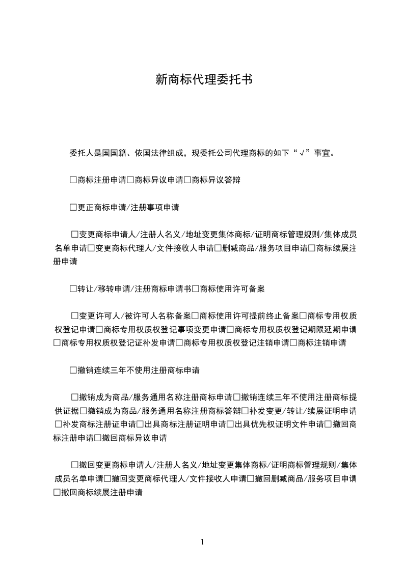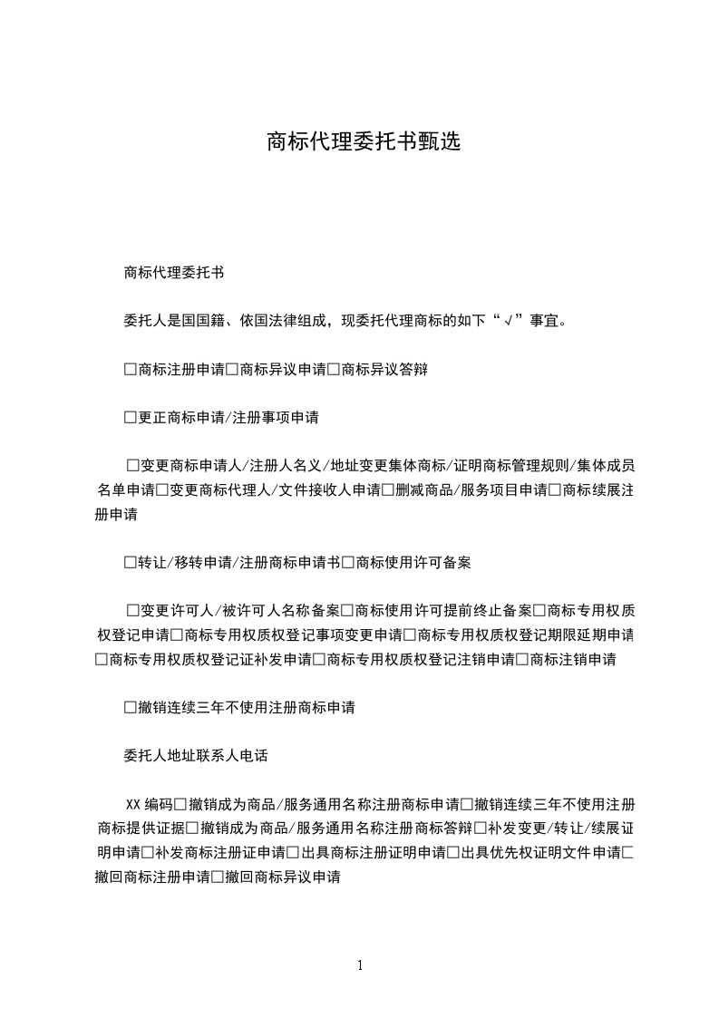 一、甲方委托乙方办理的商标事务如下:_________________□商标注册申请□商标异议申请□变更商标申请人/注册人名义/地址申请□删减商品/服务项目申请□变更商标代理人申请□更正商标申请/注册事项申请□转让申请/注册商标申请□商标续展注册申请□撤销连续三年停止使用注册商标申请□商标注销申请□注册人死亡/终止注销商标申请□补发变更/转让/续展证明申请□补发商标注册证申请□提供商标注册证明申请□提供优先权证明文件申请□商标使用许可合同备案申请□商标使用许可合同备案变更/提前终止申请□商标专用权质押登记申请□撤回商标注册申请申请□撤回商标异议申请□商标评审事宜□其他:_________________具体委托事项包括:________________不包括:________________
