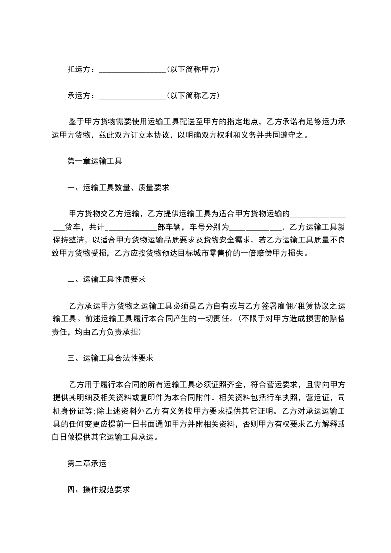 甲方货物交乙方运输,乙方提供运输工具为适合甲方货物运输的_________________货车,共计_____________部车辆,车号分别为_____________。乙方运输工具就保持整洁,以适合甲方货物运输品质要求及货物安全需求。若乙方运输工具质量不良致甲方货物受损,乙方应按货物预达目标城市零售价的一倍赔偿甲方损失。