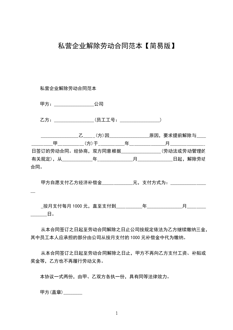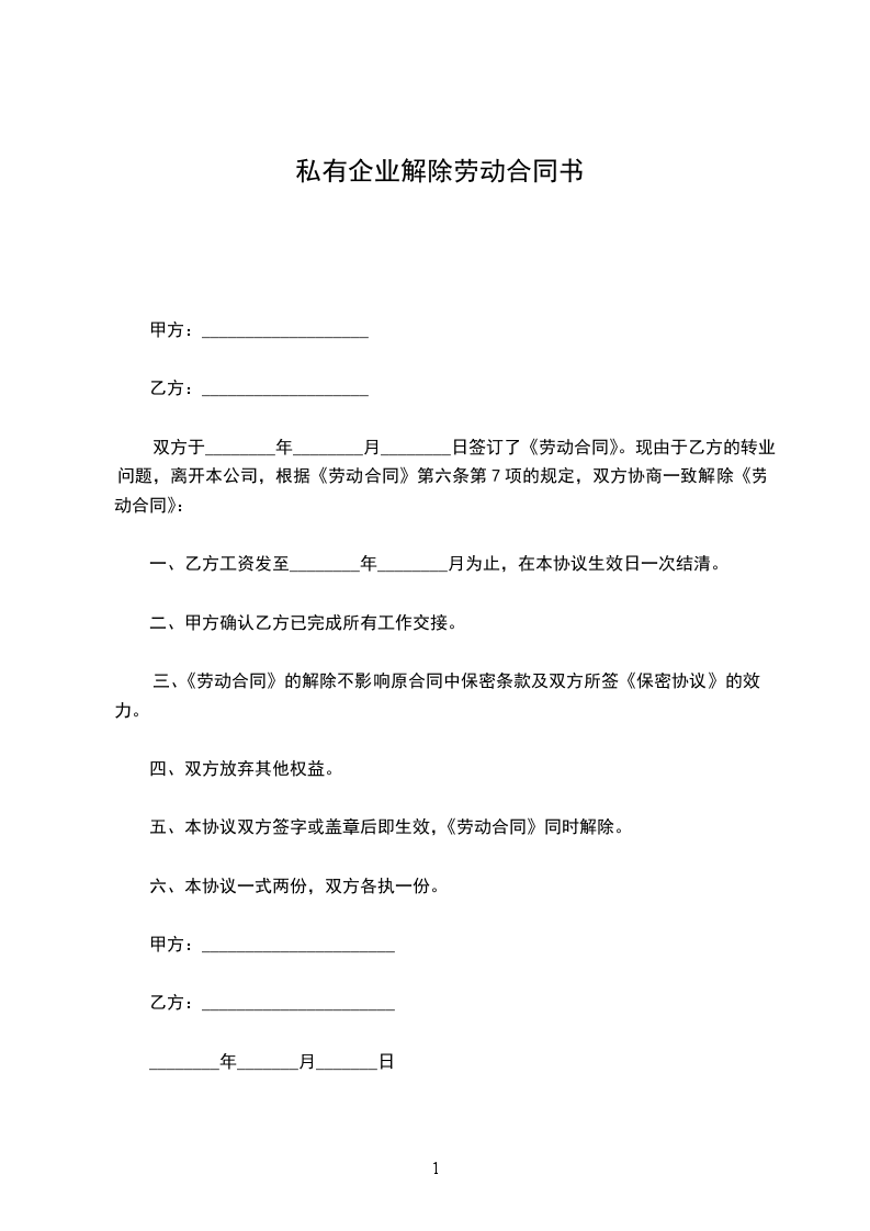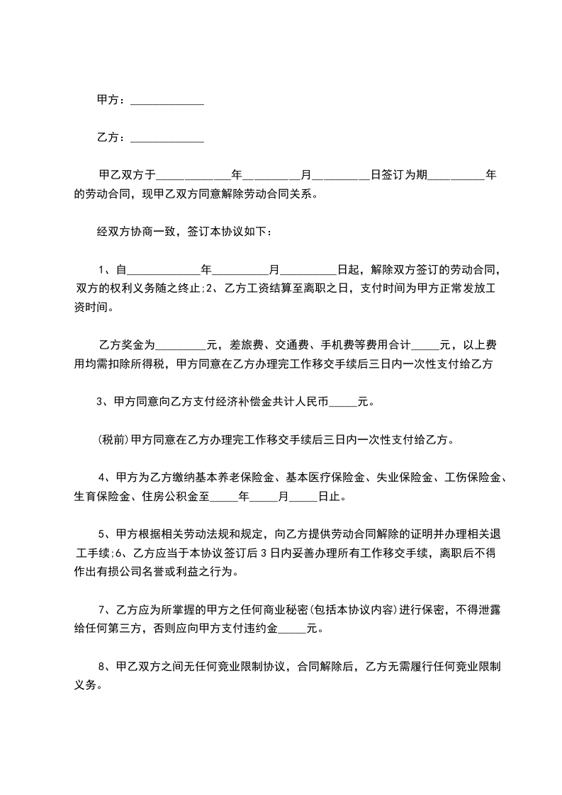 ________________乙_____(方)因_________________原因,要求提前解除与_____________甲___________(方)于___________年_______________月_______________日签订的劳动合同。经协商,双方同意根据_________________(劳动法或劳动管理的有关规定),从_____________年_______________月_______________日起,解除劳动合同。