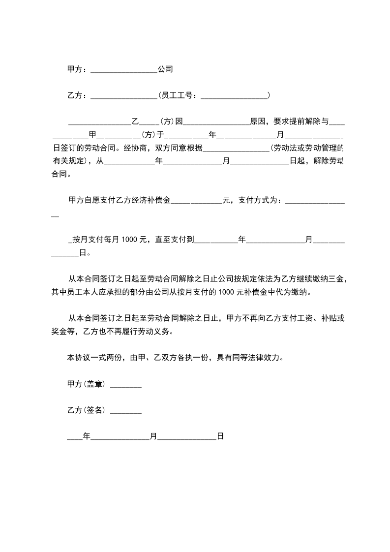 甲方自愿支付乙方经济补偿金_____________元,支付方式为:_________________