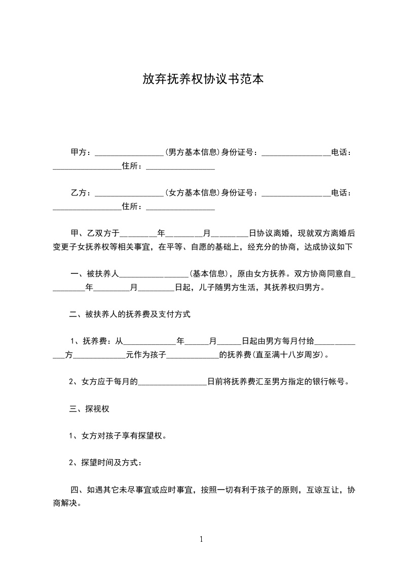 三、探望时间及方式:_________________凡双休日、节假日,如无特别事宜,男(女)方均可对孩子进行探望。探望之前,必须先经与女(男)方电话联系。探望期间,要保证孩子的安全及身心健康、愉快。