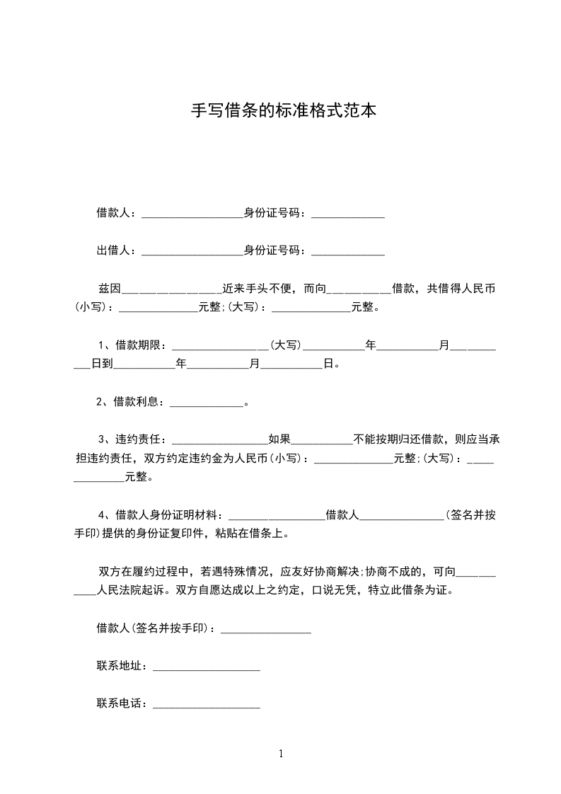 兹因_________________近来手头不便,而向___________借款,共借得人民币(小写):______________元整;(大写):______________元整。