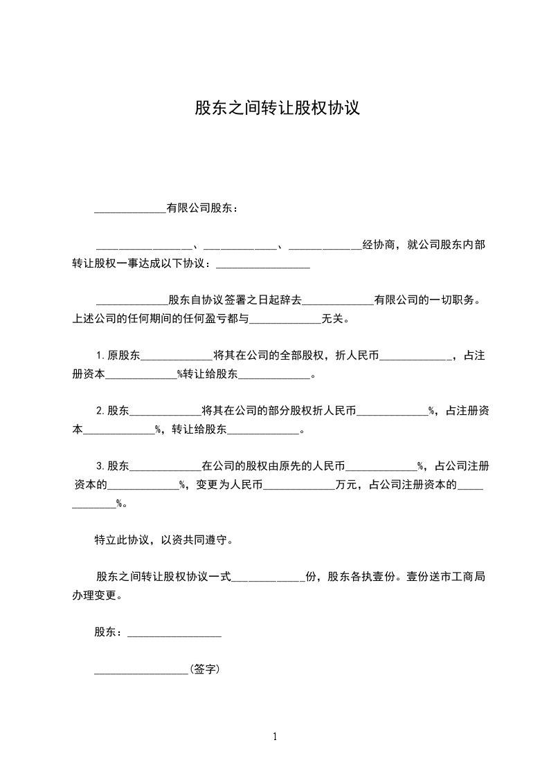 1.原股东_____________将其在公司的全部股权,折人民币_____________,占注册资本_____________%转让给股东_____________。