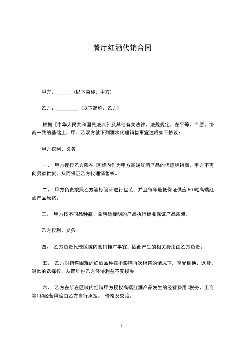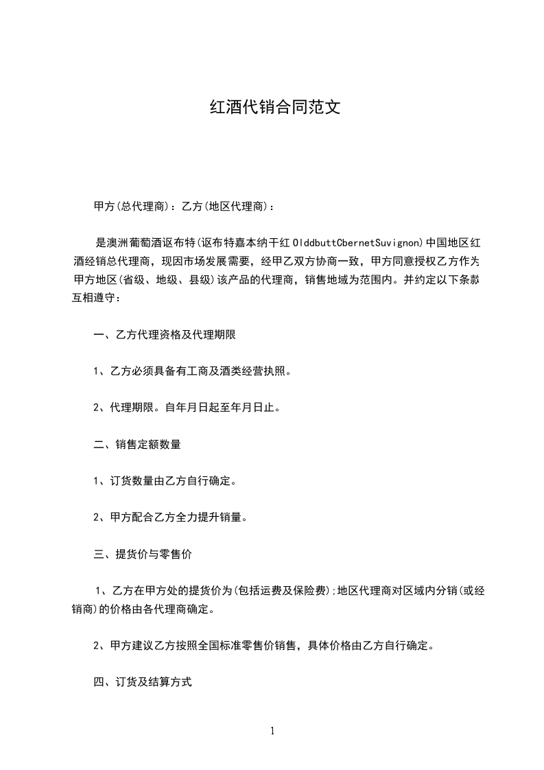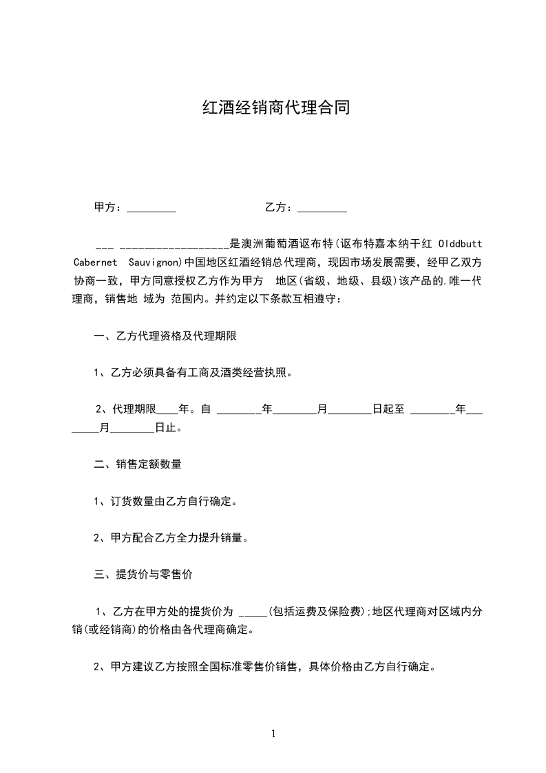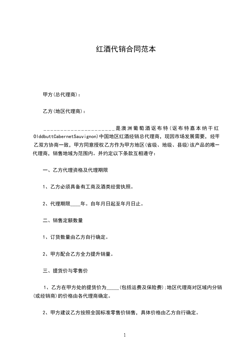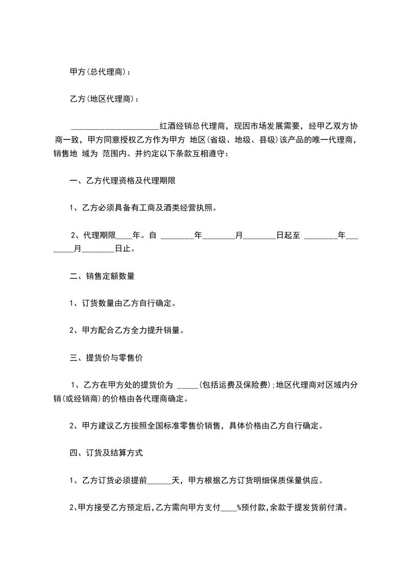 _____________________是澳洲葡萄酒讴布特(讴布特嘉本纳干红OlddbuttCabernetSauvignon)中国地区红酒经销总代理商,现因市场发展需要,经甲乙双方协商一致,甲方同意授权乙方作为甲方地区(省级、地级、县级)该产品的唯一代理商,销售地域为范围内。并约定以下条款互相遵守: