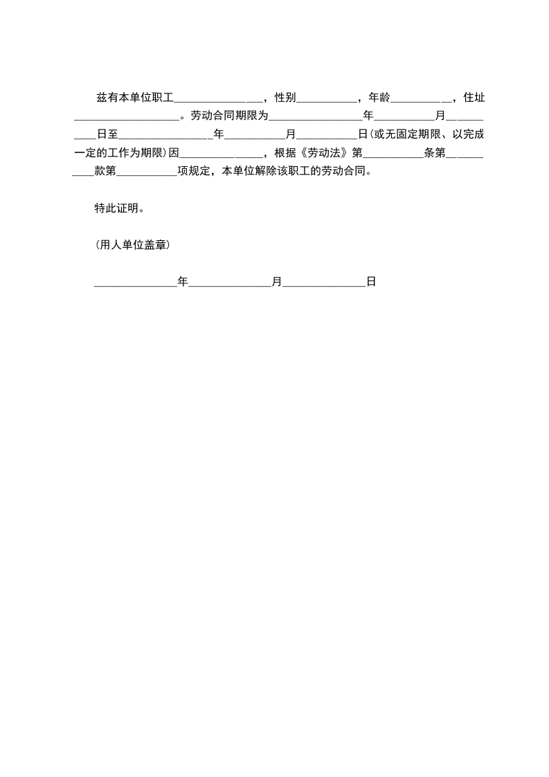 兹有本单位职工________________,性别___________,年龄___________,住址___________________。劳动合同期限为_________________年___________月___________日至_________________年___________月___________日(或无固定期限、以完成一定的工作为期限)因_______________,根据《劳动法》第___________条第___________款第___________项规定,本单位解除该职工的劳动合同。