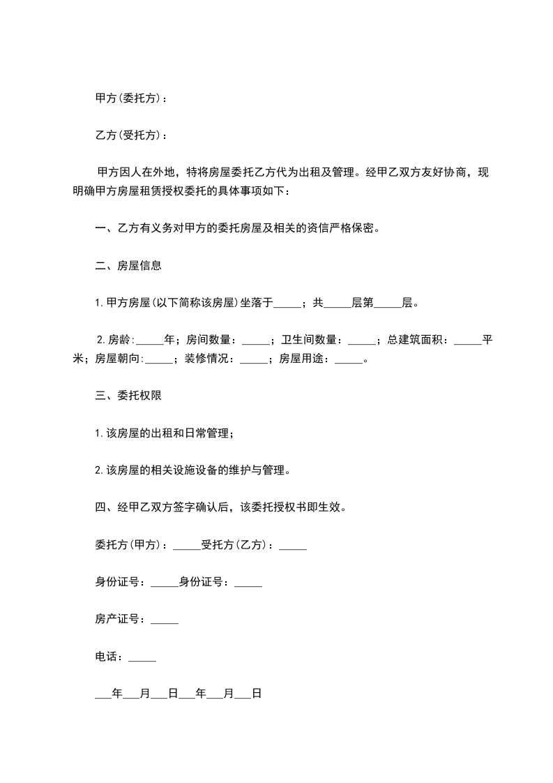 甲方因人在外地,特将房屋委托乙方代为出租及管理。经甲乙双方友好协商,现明确甲方房屋租赁授权委托的具体事项如下: