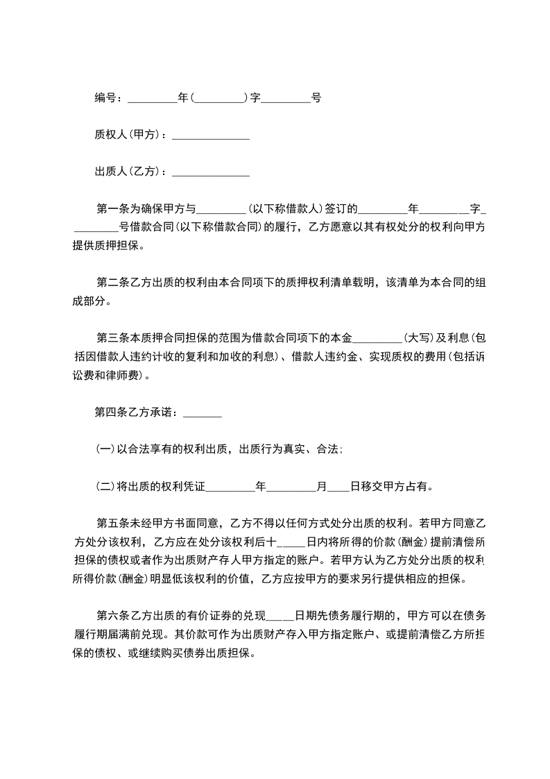 第一条为确保甲方与_________(以下称借款人)签订的_________年_________字_________号借款合同(以下称借款合同)的履行,乙方愿意以其有权处分的权利向甲方提供质押担保。