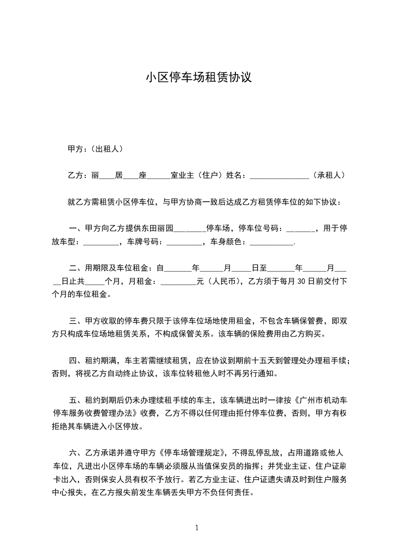 一、甲方向乙方提供东田丽园________停车场,停车位号码:_______,用于停放车型:_________,车牌号码:_________,车身颜色:___________.